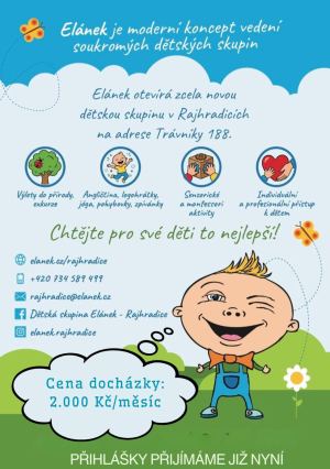 V Rajhradicích se bude nově otevírat dětská skupina Elánek na adrese Trávníky 188.