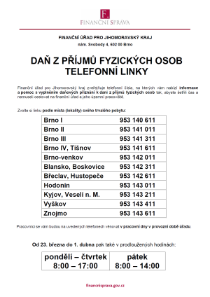 Telefonní linky pro informace k daňovému přiznání k dani z příjmu fyzických osob