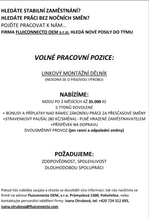 Firma Fluiconnecto Pohořelice přijme nové zaměstnance na dvousměnný provoz do výroby. Mzda až 35.000,- + příspěvek na dopravu. Pro více informací volejte: 724 312 693.
