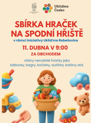 Milí sousedé, kdo máte doma již nepotřebné hračky vhodné na pískoviště, přineste nám je prosím na akci Ukliďme Rebešovice dne 11.4. v 9:00. Dětem na spodním hřišti určitě ještě udělají radost. A my přebytečné hračky uschováme a budeme je průběžně doplňovat a obměňovat za ty staré a rozbité.
