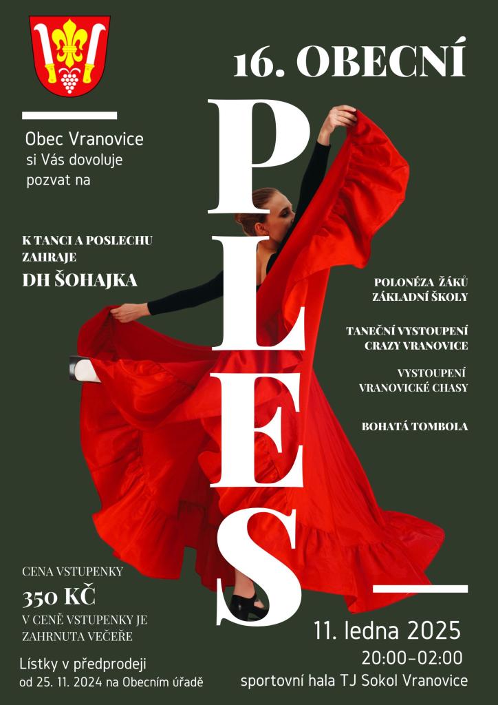 Obec Vranovice pořádá ples, na kterém zahraje DH Šohajka. Součástí programu je polonéza žáků základní školy, taneční vystoupení skupiny Crazy Vranovice a vystoupení Vranovické chasy. K dispozici bude bohatá tombola. Ples se koná 11. ledna 2025 od 20:00 do 02:00 v sportovní hale TJ Sokol Vranovice. Vstupné činí 350 Kč, v ceně je zahrnuta večeře. Lístky v předprodeji od 25. 11. 2024 na Obecním úřadě.