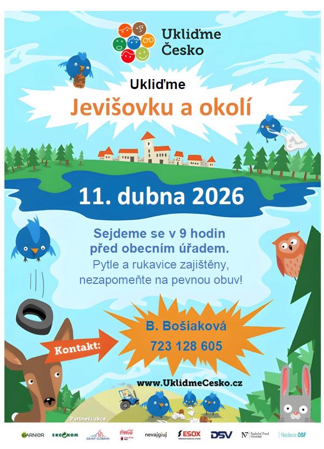 Akce Ukliďme Česko se koná 11. dubna 2026 v Jevišovce. Sejdeme se před obecním úřadem v 9 hodin. Účastníci obdrží pytle a rukavice, je však nutné mít na paměti, že je nutné se obléct do vhodné obuvi. Tato akce je skvělou příležitostí, jak se aktivně zapojit do úklidu přírody a přispět k čistšímu prostředí.